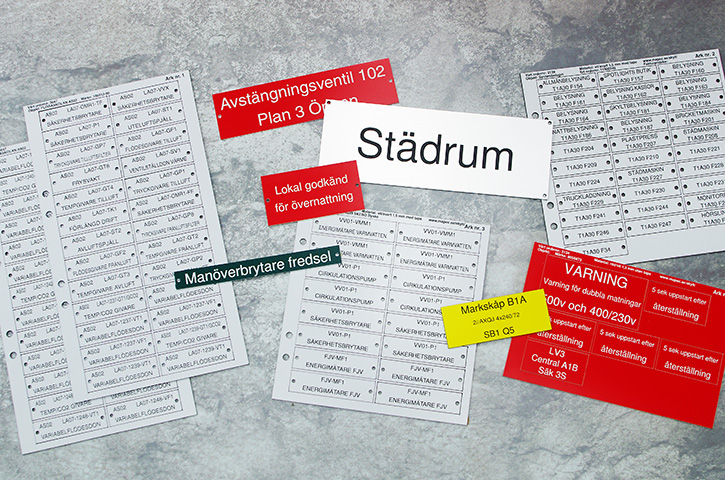 Levereras sorterad på ark/rulle. Beställs enkelt i vårt beställningssystem på samma sätt som märkskyltarna.